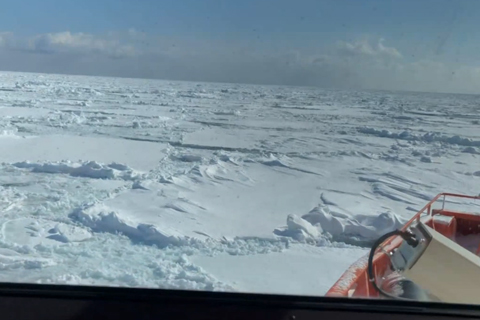 一面の氷が織りなす白銀の世界を、流氷を豪快に割りながら進む迫力満点のシーン。