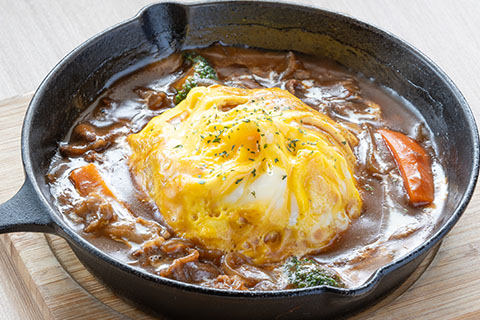 オムライスとビーフシチュー、スキレットで熱々で提供します。